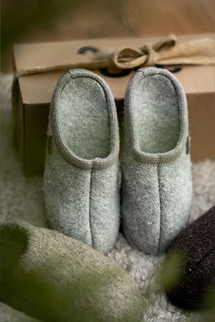 Exklusiva ulltofflor i 100% mohairull med ergonomiskt uppbyggd sula och halkfri undersida.